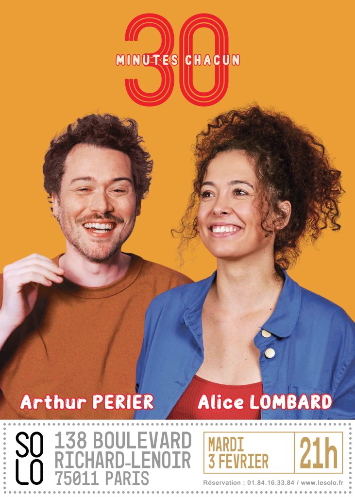 Arthur Perier et Alice Lombard présentent un 30/30 de stand up au Solo, 30 minutes chacun, une heure de rires.