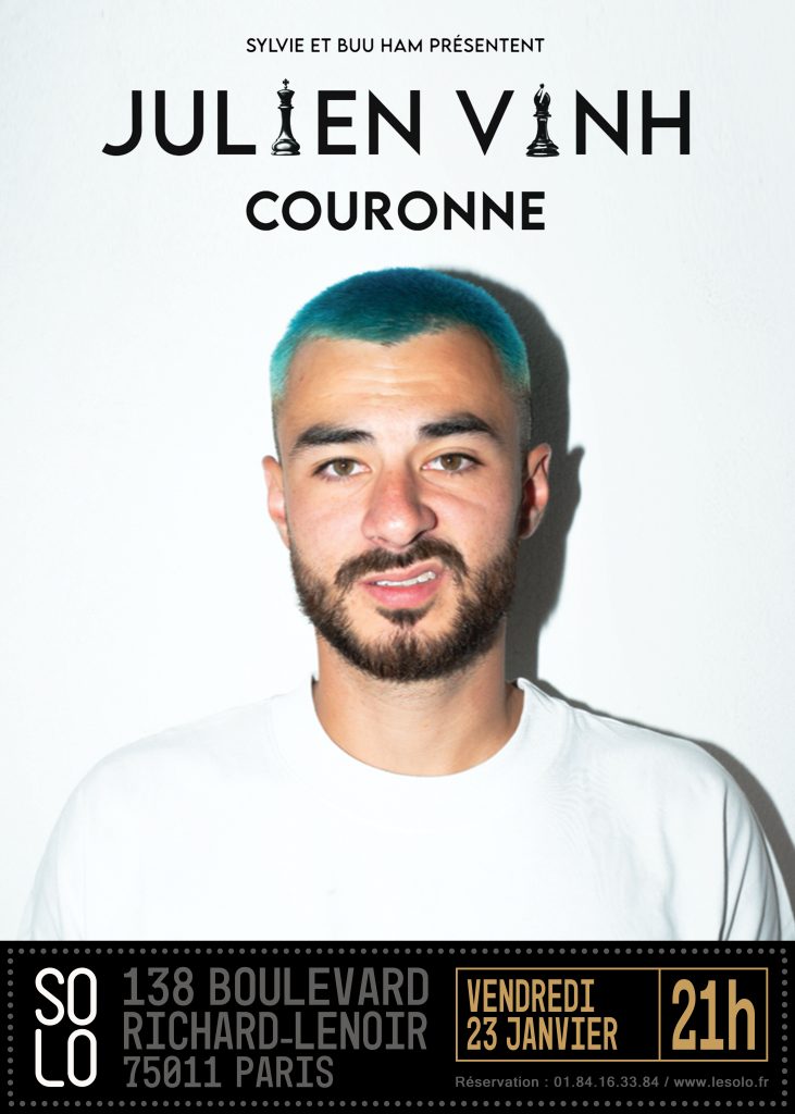Couronne est un spectacle de pur stand-up, pendant plus d’une heure, Julien Vinh raconte sa vie de son l’enfance à son choix de tout plaquer pour vivre de sa passion : la scène.