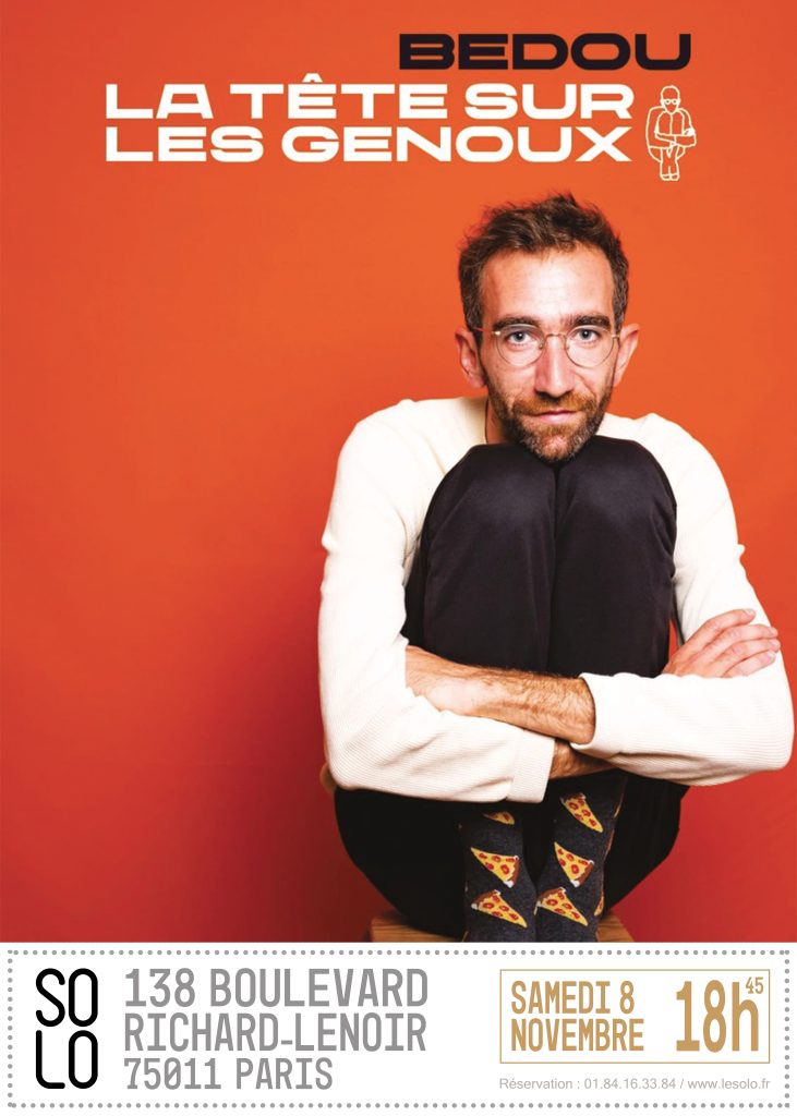 Humoriste invertébré et curieux invétéré , Bedou a développé, tel le phasme, son animal totem, des stratégies de mimétisme lui permettant de s’adapter à chaque situation ; mais s’il retourne sa veste c’est uniquement parce qu’il est fier de ses chemises bigarrés et audacieuses qu’il porte sans cravate (audace on a dit).  Il observe, dissèque ce qu’il entoure dans cette position singulière. Bedou joue son premier spectacle, debout sur scène pour le coup. Un spectacle intimiste et conversationnel. Et à défaut d’avoir la tête sur les épaules, il a la tête sur les genoux.
